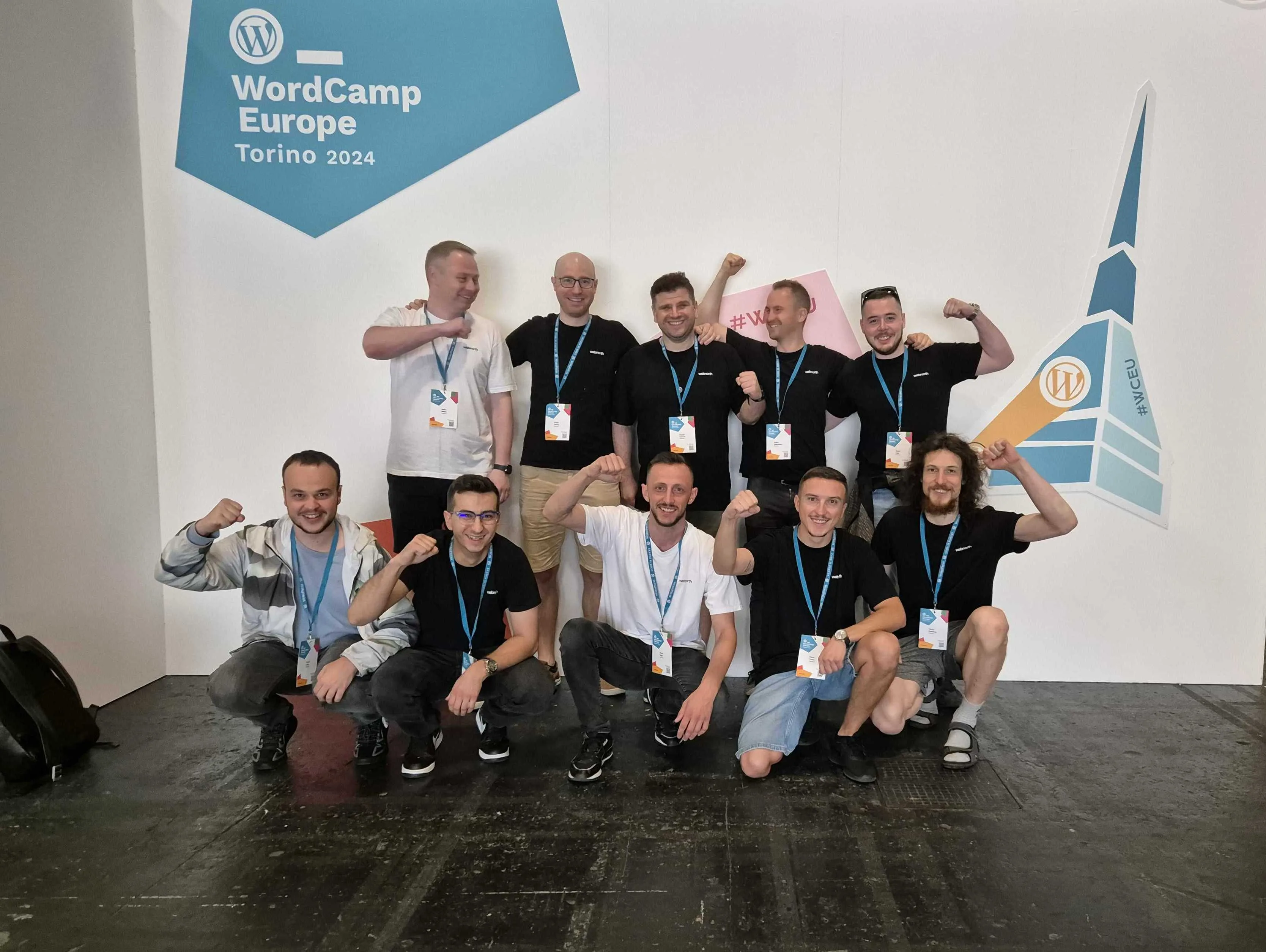 Nogle af medlemmerne af vores dygtige WordPress-team tog et gruppefoto ved WordCamp-konferencen 2024 i Torino.